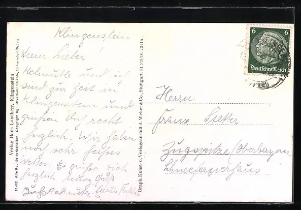 Personenbezogene Daten auf der Rückseite der Karte wurden durch blauen Textmarker unkenntlich gemacht. Die blauen Stellen sind auf die Vorderseite durchgeweicht und wirken sich negativ auf das Postkartenfoto aus