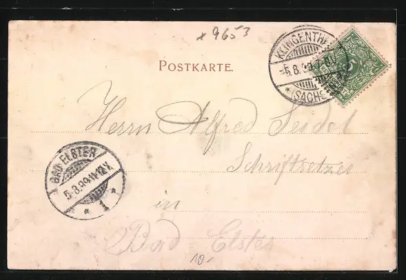 Personenbezogene Daten auf der Rückseite der Karte wurden durch blauen Textmarker unkenntlich gemacht. Die blauen Stellen sind auf die Vorderseite durchgeweicht und wirken sich negativ auf das Postkartenfoto aus