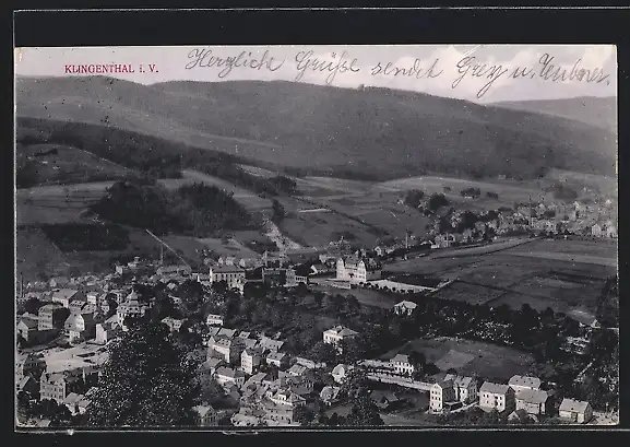 AK Klingenthal i. V., Totalansicht von einem Berg aus