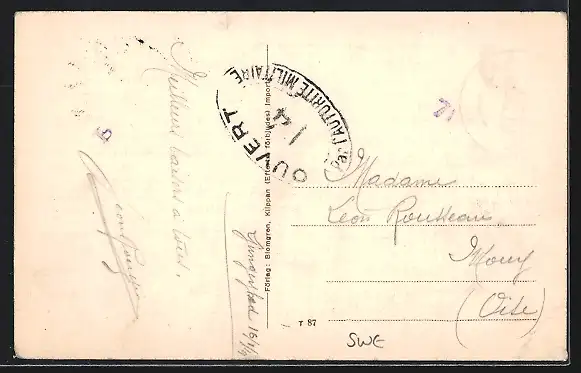 Personenbezogene Daten auf der Rückseite der Karte wurden durch blauen Textmarker unkenntlich gemacht. Die blauen Stellen sind auf die Vorderseite durchgeweicht und wirken sich negativ auf das Postkartenfoto aus