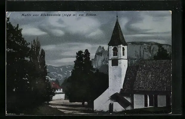 AK Klobenstein am Ritten, Ortspartie mit Kirche am Abend