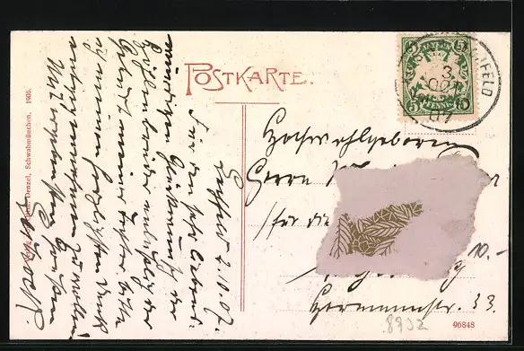 Personenbezogene Daten auf der Rückseite der Karte wurden durch blauen Textmarker unkenntlich gemacht. Die blauen Stellen sind auf die Vorderseite durchgeweicht und wirken sich negativ auf das Postkartenfoto aus