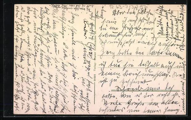Personenbezogene Daten auf der Rückseite der Karte wurden durch blauen Textmarker unkenntlich gemacht. Die blauen Stellen sind auf die Vorderseite durchgeweicht und wirken sich negativ auf das Postkartenfoto aus
