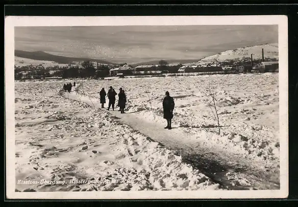 AK Klosterneuburg, Eisstoss-Übergang mit Passanten