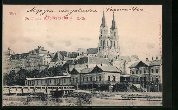 AK Klosterneuburg, Ortsansicht mit Kirche und Donau