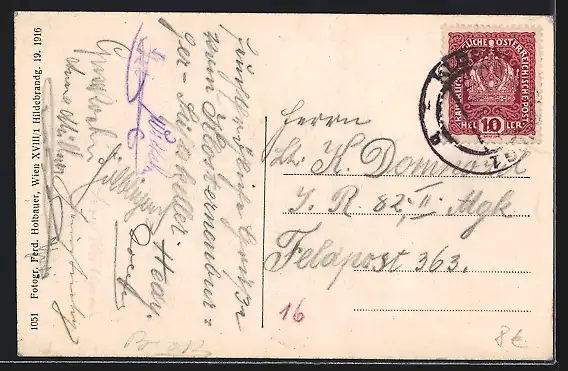 Personenbezogene Daten auf der Rückseite der Karte wurden durch blauen Textmarker unkenntlich gemacht. Die blauen Stellen sind auf die Vorderseite durchgeweicht und wirken sich negativ auf das Postkartenfoto aus