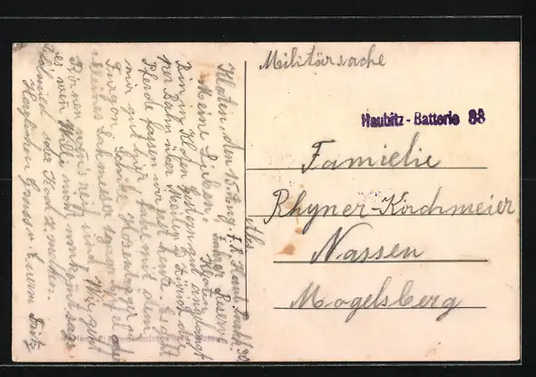 Personenbezogene Daten auf der Rückseite der Karte wurden durch blauen Textmarker unkenntlich gemacht. Die blauen Stellen sind auf die Vorderseite durchgeweicht und wirken sich negativ auf das Postkartenfoto aus