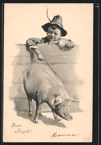 AK Knabe kitzelt ein Schwein, Neujahrsgruss
