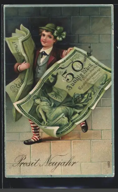 AK Knabe mit Geldscheinen - Neujahrsgruss