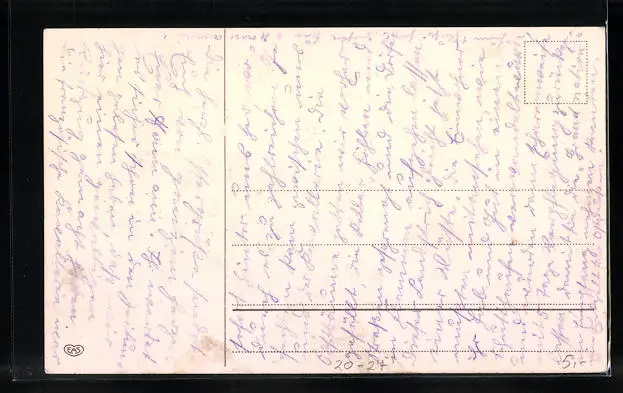Personenbezogene Daten auf der Rückseite der Karte wurden durch blauen Textmarker unkenntlich gemacht. Die blauen Stellen sind auf die Vorderseite durchgeweicht und wirken sich negativ auf das Postkartenfoto aus