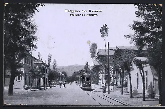 AK Kniajevo, Ortspartie mit Strassenbahn