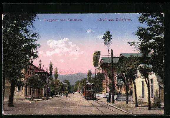 AK Kniajewo, Strassenpartie mit Strassenbahn