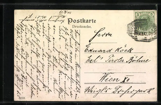 Personenbezogene Daten auf der Rückseite der Karte wurden durch blauen Textmarker unkenntlich gemacht. Die blauen Stellen sind auf die Vorderseite durchgeweicht und wirken sich negativ auf das Postkartenfoto aus