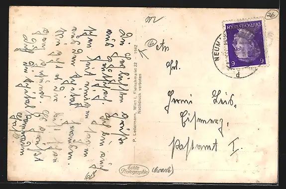 Personenbezogene Daten auf der Rückseite der Karte wurden durch blauen Textmarker unkenntlich gemacht. Die blauen Stellen sind auf die Vorderseite durchgeweicht und wirken sich negativ auf das Postkartenfoto aus