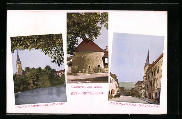 AK Knittelfeld, Stadtturm, Kirche und Teich mit Lutherkanzel