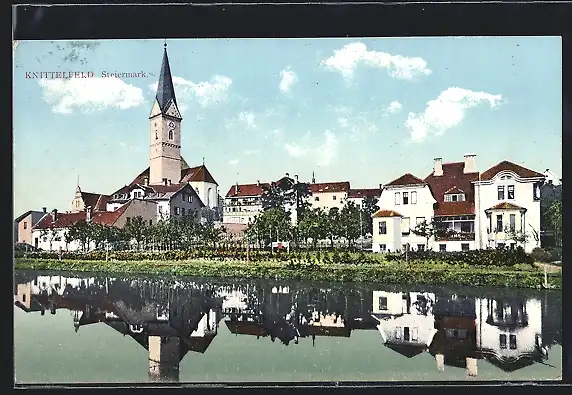 AK Knittelfeld /Steiermark, Uferpartie mit Kirche