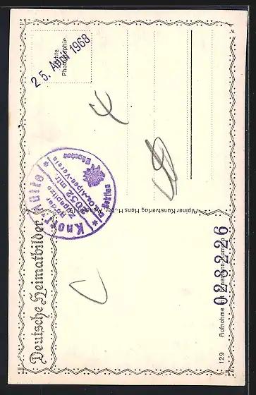 Personenbezogene Daten auf der Rückseite der Karte wurden durch blauen Textmarker unkenntlich gemacht. Die blauen Stellen sind auf die Vorderseite durchgeweicht und wirken sich negativ auf das Postkartenfoto aus