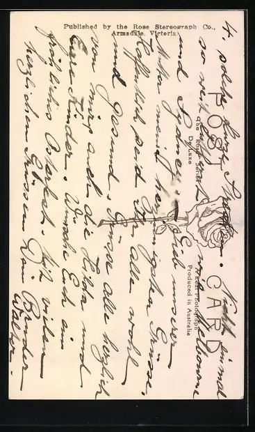 Personenbezogene Daten auf der Rückseite der Karte wurden durch blauen Textmarker unkenntlich gemacht. Die blauen Stellen sind auf die Vorderseite durchgeweicht und wirken sich negativ auf das Postkartenfoto aus