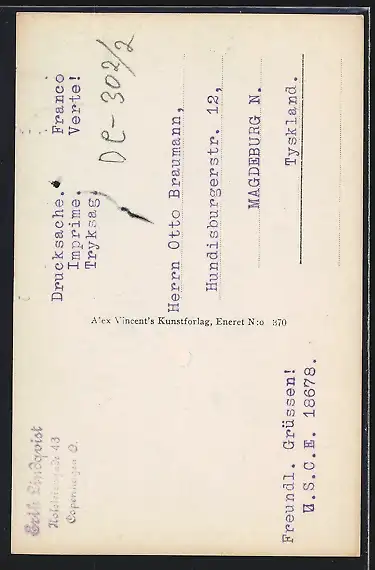 Personenbezogene Daten auf der Rückseite der Karte wurden durch blauen Textmarker unkenntlich gemacht. Die blauen Stellen sind auf die Vorderseite durchgeweicht und wirken sich negativ auf das Postkartenfoto aus