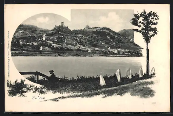 AK Kobern, Blick über den Rhein auf die Burgruine