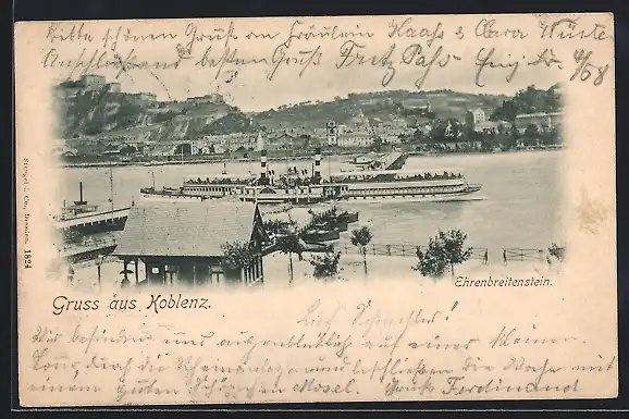 AK Koblenz, Blick auf die Festung Ehrenbreitstein mit Schiffsbrücke und Dampfer
