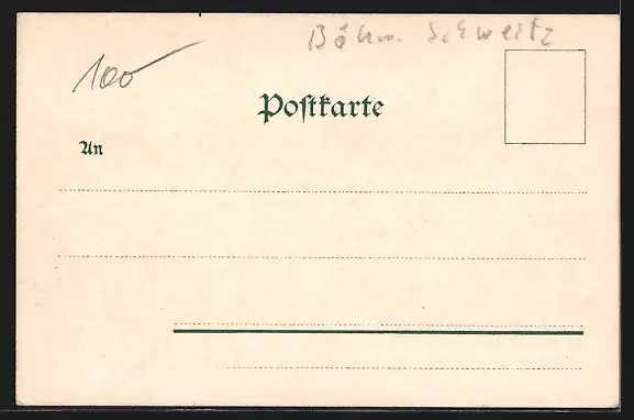 Personenbezogene Daten auf der Rückseite der Karte wurden durch blauen Textmarker unkenntlich gemacht. Die blauen Stellen sind auf die Vorderseite durchgeweicht und wirken sich negativ auf das Postkartenfoto aus