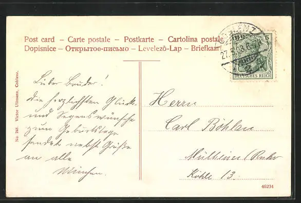 alte Ansichtskarte, gelaufen 1908, Stempelspur, guter Zustand