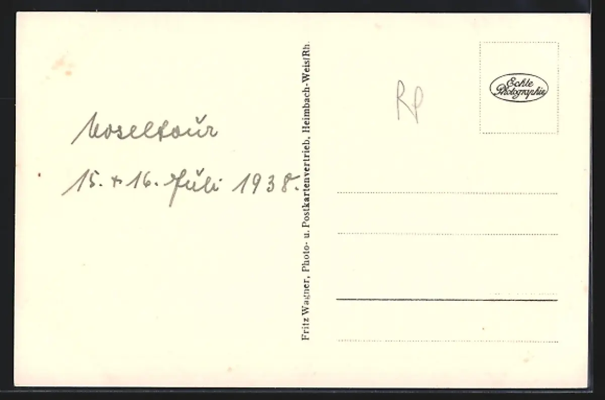 Personenbezogene Daten auf der Rückseite der Karte wurden durch blauen Textmarker unkenntlich gemacht. Die blauen Stellen sind auf die Vorderseite durchgeweicht und wirken sich negativ auf das Postkartenfoto aus