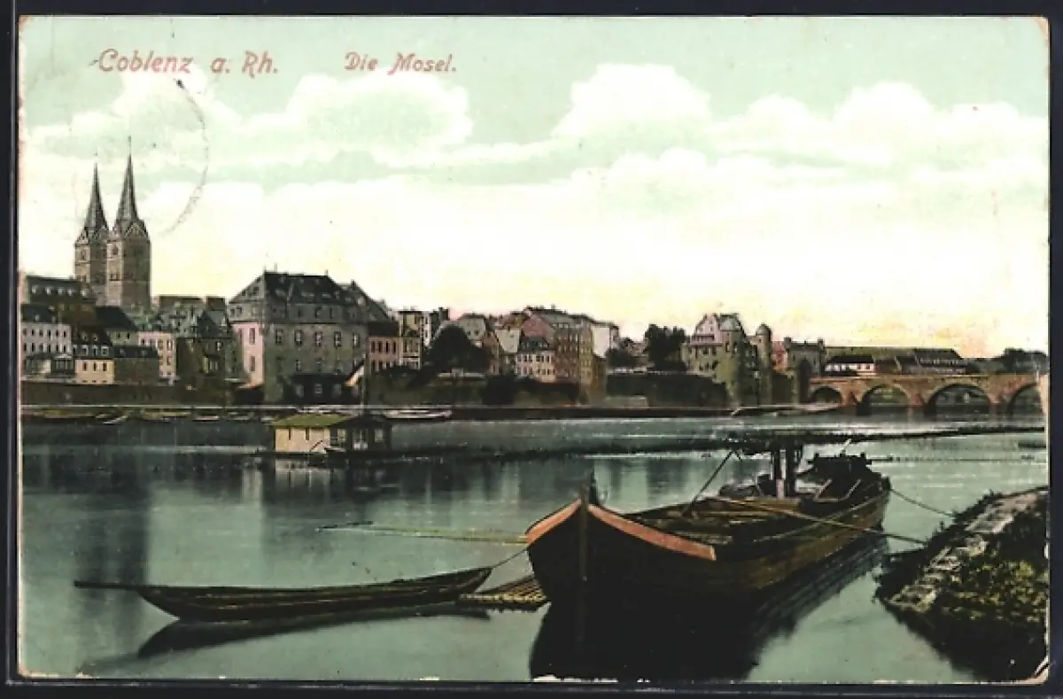 AK Koblenz a. Rh., Die Mosel, Brücke, Kirche, Schiffe