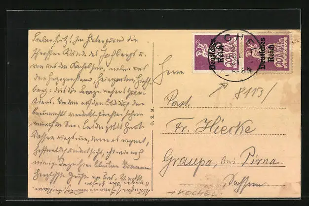 Personenbezogene Daten auf der Rückseite der Karte wurden durch blauen Textmarker unkenntlich gemacht. Die blauen Stellen sind auf die Vorderseite durchgeweicht und wirken sich negativ auf das Postkartenfoto aus