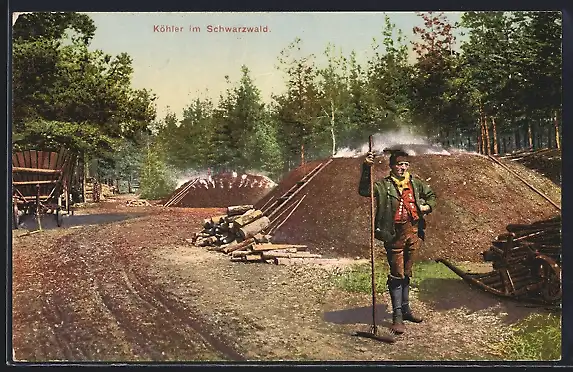 AK Köhler im Schwarzwald, mit rauchenden Meilern und Wagen