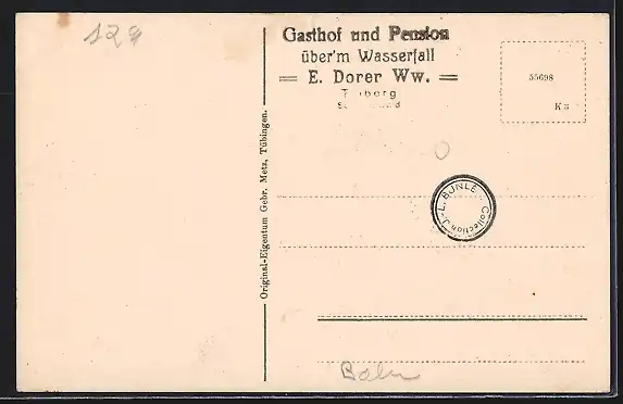 Personenbezogene Daten auf der Rückseite der Karte wurden durch blauen Textmarker unkenntlich gemacht. Die blauen Stellen sind auf die Vorderseite durchgeweicht und wirken sich negativ auf das Postkartenfoto aus