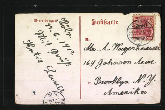 gelaufen 1912, Eckknicke li. oben und re. unten, Kante beschädigt oben li., guter Zustand