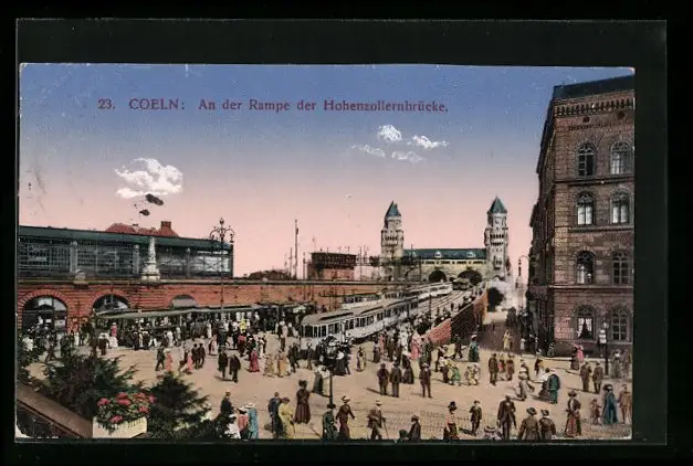 AK Köln, An der Rampe der Hohenzollernbrücke mit Strassenbahn