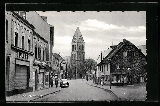 AK Köln-Dellbrück, Strassenpartie mit Kirche, Auto