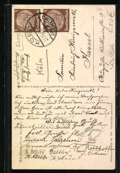 Personenbezogene Daten auf der Rückseite der Karte wurden durch blauen Textmarker unkenntlich gemacht. Die blauen Stellen sind auf die Vorderseite durchgeweicht und wirken sich negativ auf das Postkartenfoto aus