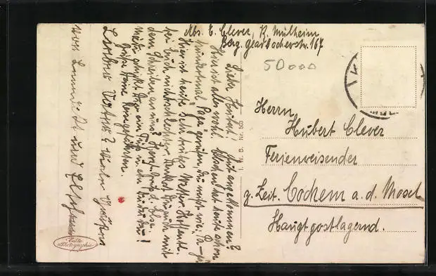 Personenbezogene Daten auf der Rückseite der Karte wurden durch blauen Textmarker unkenntlich gemacht. Die blauen Stellen sind auf die Vorderseite durchgeweicht und wirken sich negativ auf das Postkartenfoto aus