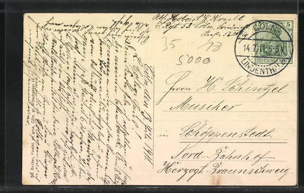 Personenbezogene Daten auf der Rückseite der Karte wurden durch blauen Textmarker unkenntlich gemacht. Die blauen Stellen sind auf die Vorderseite durchgeweicht und wirken sich negativ auf das Postkartenfoto aus