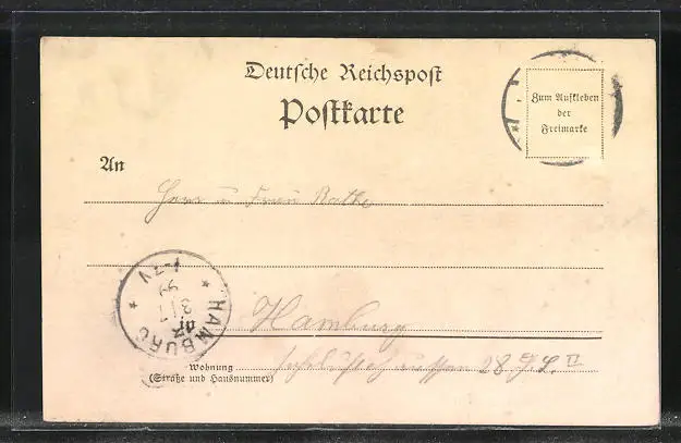 alte Ansichtskarte, gelaufen 1899, Briefmarke entfernt, rückseitig Oberflächenschaden, Stempelspur, guter Zustand