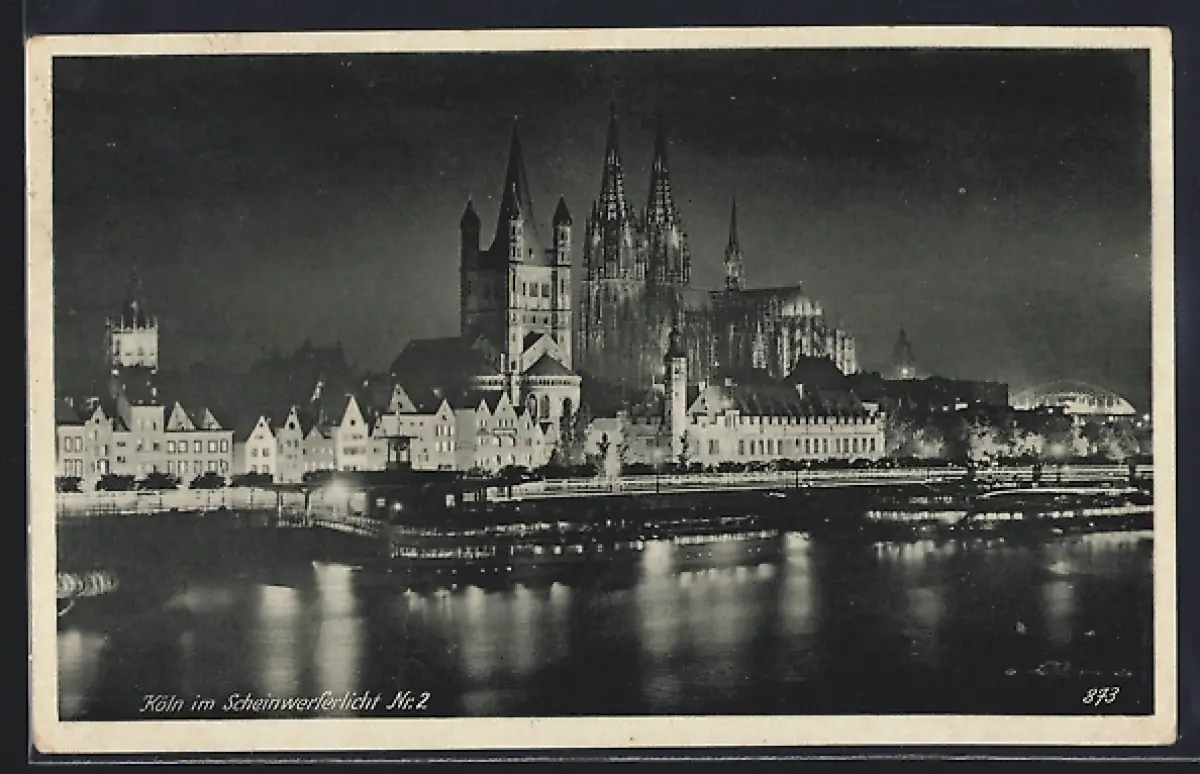 AK Köln, Dom und Altstadt im Scheinwerferlicht