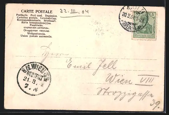 gelaufen 1904, Eckknick re. oben, Bugspur li. unten, guter Zustand