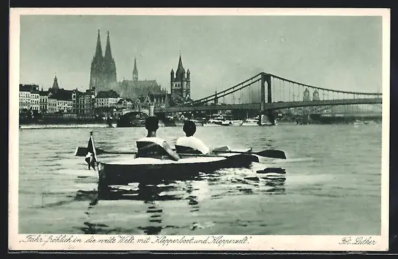 AK Köln, Fahr fröhlich in die weite Welt, mit Klepperboot und Klepperzelt, Blick zum Dom