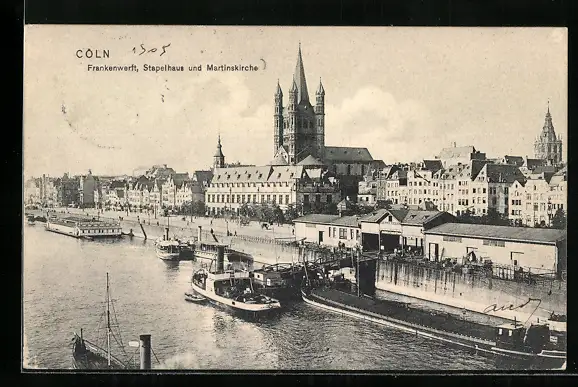 AK Köln, Frankenwerft, Stapelhaus und Martinskirche, Schiffe