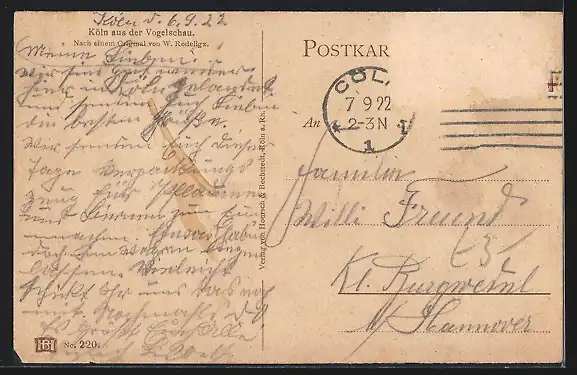 gelaufen 1922, Briefmarke entfernt, rückseitig Oberflächenschaden, Einriss li. oben, Eckknick unten re., guter Zustand