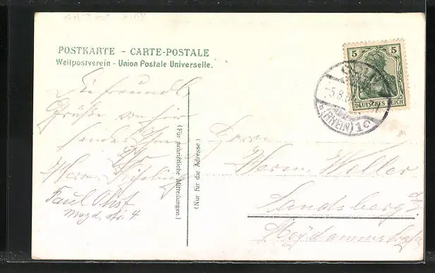 Personenbezogene Daten auf der Rückseite der Karte wurden durch blauen Textmarker unkenntlich gemacht. Die blauen Stellen sind auf die Vorderseite durchgeweicht und wirken sich negativ auf das Postkartenfoto aus