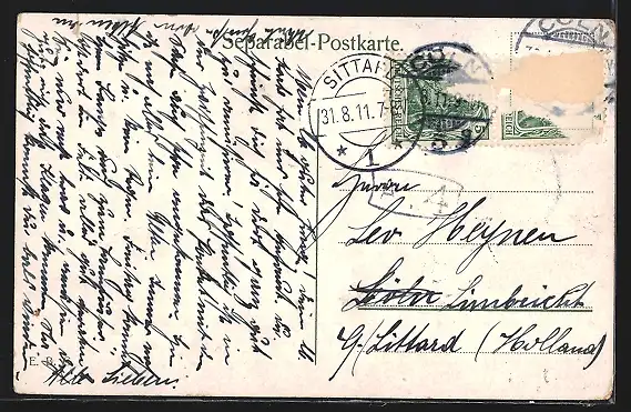 alte Ansichtskarte, gelaufen 1911, Briefmarke entfernt, rückseitig Oberflächenschaden, Stempelspur, guter Zustand