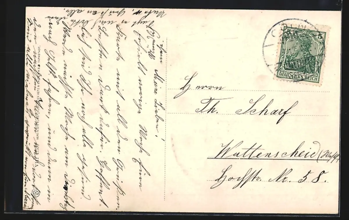 Personenbezogene Daten auf der Rückseite der Karte wurden durch blauen Textmarker unkenntlich gemacht. Die blauen Stellen sind auf die Vorderseite durchgeweicht und wirken sich negativ auf das Postkartenfoto aus
