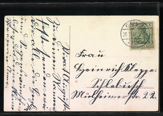 Personenbezogene Daten auf der Rückseite der Karte wurden durch blauen Textmarker unkenntlich gemacht. Die blauen Stellen sind auf die Vorderseite durchgeweicht und wirken sich negativ auf das Postkartenfoto aus