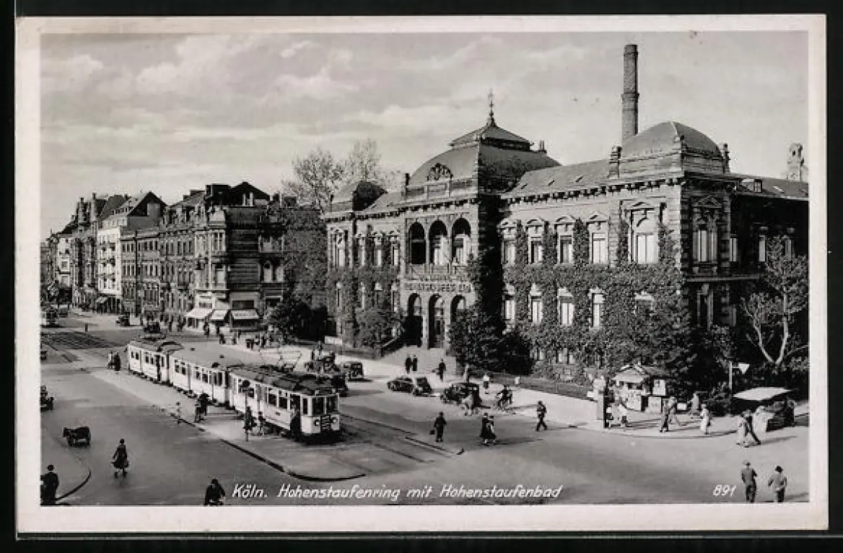 AK Köln, Hohenstaufenring m. Hohenstaufenbad und Strassenbahn