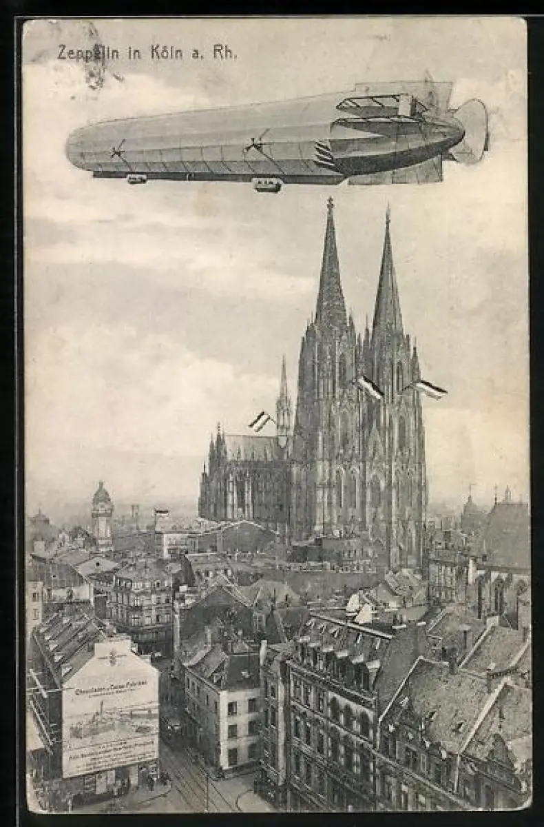 AK Köln, Luftschiff Zeppelin über der Stadt